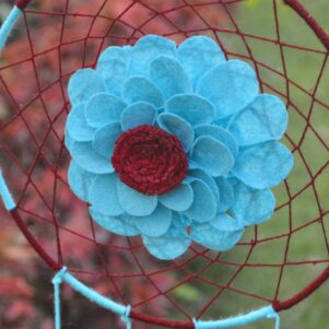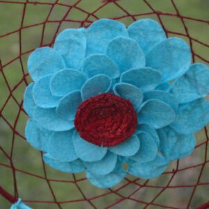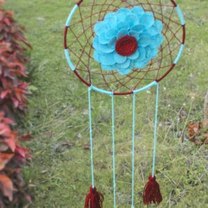 Dream catcher made up of woolen yarn and decorated with handmade felt flowers and a hanging tassel.