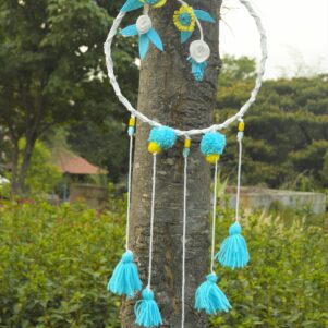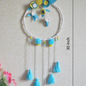 A beautiful hand-crafted wall hanging, which is made up of paper wrapped wire which is twisted together to give a circular shape, is decorated with handmade felt flowers leaf and hanging tassel which adds value to the product.. A perfect home decoration and beautiful wall hanging to enhance the beauty of the living room, balcony, and other space. It can be used as a party or occasion prop such as Mehdi and sangeet, also it is a great Gift item for Your Loved Ones who loves handmade products.
