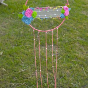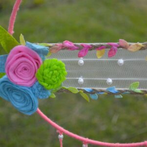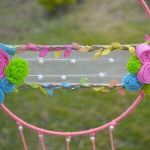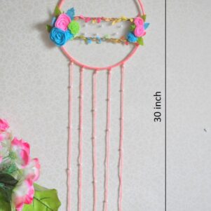 A beautiful hand-crafted woolen yarn wall hanging. which is made up of net fabric, decorated with hand-stitched felt flowers, hanging pearls which adds value to the product. A perfect home decoration and beautiful wall hanging to enhance the beauty of the living room, balcony, and other space. It can be used as a theme-based party or occasion prop such as Mehdi and sangeet, also it is a  great Gift item for Your Loved Ones who loves handmade products.