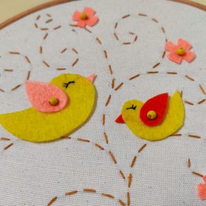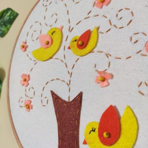 Beautiful handmade cute little felt birds family artwork. It is beautifully crafted with felt cutwork and running stitches hand embroidery applied on a muslin fabric base which is mounted on a wooden hoop. A perfect hoop Art, to enhance the wall and add value to your kid’s room, which motivates our kids. A wall hanging for kids’ bedroom, living room, and balcony. This is an entirely handmade product that can be gifted to your loved one.