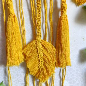 A beautiful handmade macramé wall hanging which is made up of cotton macramé yarn is decorated with handmade leaves which adds value to the product. It repels negativity of your belonging and gives you positive vibes. It is renowned for its powerful spiritual qualities it traps bad dreams within its intricate web so that you can sleep more peacefully with colorful dreams. Perfect home decoration and beautiful wall hanging to enhance the beauty of the living room, balcony, and other spaces. It can be used as a party or occasion prop such as Mehdi and sangeet, also it is a great Gift item for Your Loved Ones who loves handmade products.