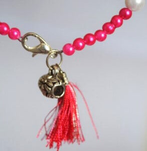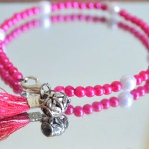Pink and white bead bracelet with anti silver lock and tassel hanging.