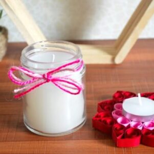 Jar candle decorated with jute flower along with dual colour quilling platter.