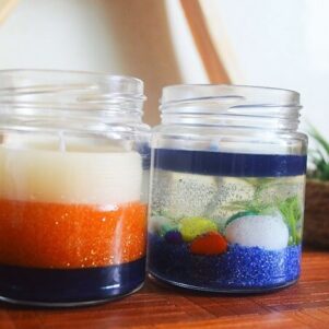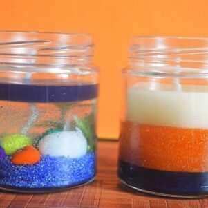 Set of two glass jar candles with transparent wax gel and solid wax, decorated with pebbles to give an underwater look.