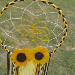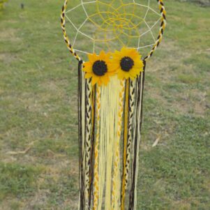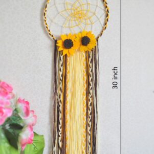 A beautiful hand-crafted Dream catcher, which is made up of woollen yarn, it is decorated with handmade felt sunflowers and hanging woollen braided yarn which adds value to the product.